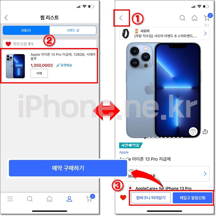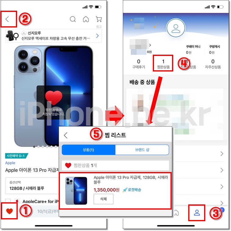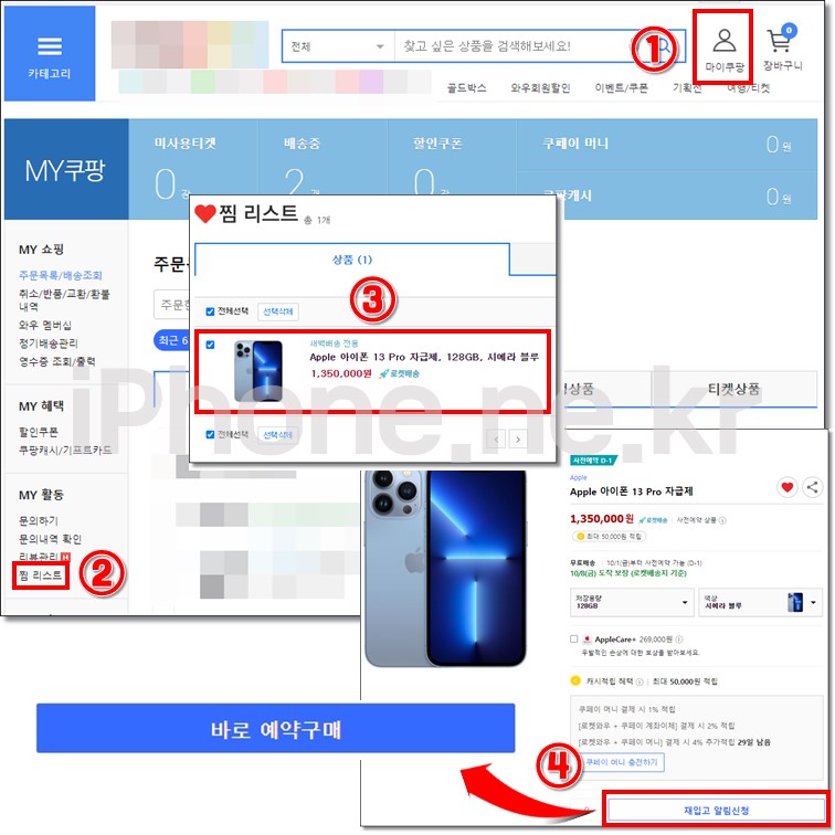 - ①마이 쿠팡 ▶ ②찜 리스트 ▶ ③찜한 상품