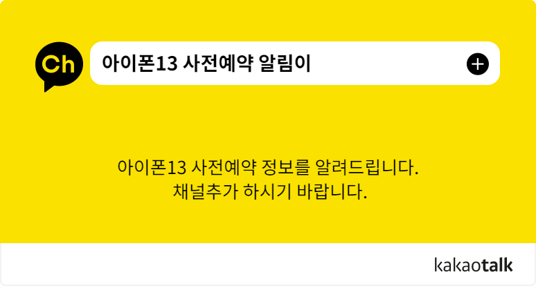 아이폰 13 2차 사전예약 일정이 나오게 되면 카카오톡으로 알림을 받을 수 있다. 아래 카톡 채널을 추가하여, 놓쳤던 아이폰13 구매를 꼭 성공시키자!